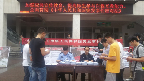 在“5·12”汶川特大地震六周年和第六个“全国防灾减灾日”到来之际,按照湖南省政府办公厅和省教育厅有关通知要求,学校保卫处组织各二级单位从5月12日起,在校园开展为期一周的应急知识宣传活动。本次活动旨在全校广泛宣传和普及应急常识,不断增强广大师生的风险防灾意识,动员大家了解、参与、支持应急管理工作,提高大家自救互救能力,为创建“和谐校园、平安校园”创造良好的条件。