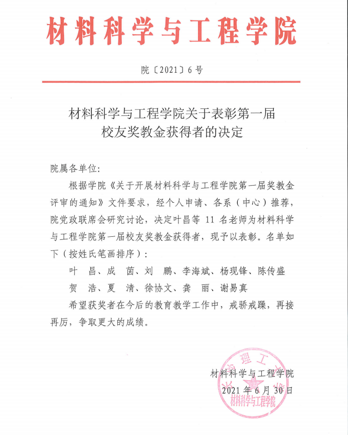 材料科学与工程学院关于表彰第一届校友奖教金获得者的决定(院〔2021〕6号)