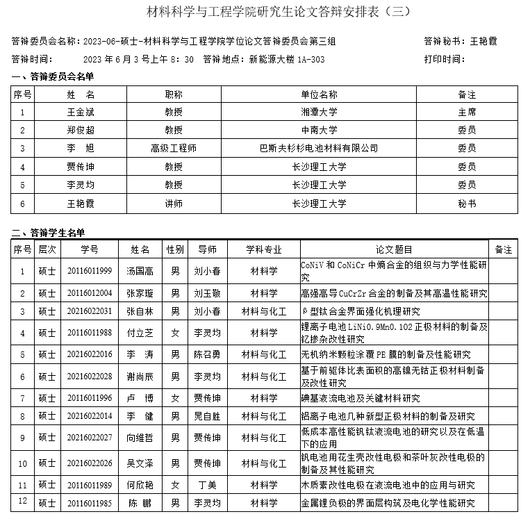 材料科学与工程学院第三组答辩安排表
