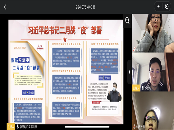 3月4日,学生党支部依托“腾讯会议”平台视频会议召开了线上专题组织生活会。全体党员共同观看了战“疫”感人视频,纷纷向战斗在一线的医护工作者、人民子弟兵等最美逆行者致敬,学习了《习近平总书记在统筹推进新冠肺炎疫情防控和经济社会发展工作部署》等重要指示批示精神,以及“教育部致全国大学生的一封信”等内容,从疫情发生以来联防联控的成效解读了中国制度的显著优势,分享了关于中国精神、中国力量的理解。在支部成员交流感悟环节,进行了《一名党员、一面旗帜》的主题分享,引申了雷锋精神及其现实意义,对疫情下的雷锋精神进行了详细介绍,并表示要以实际行动丰富新时代雷锋精神的内涵。最后,全体党员诵读“停课不停学,党员做表率”倡议书。