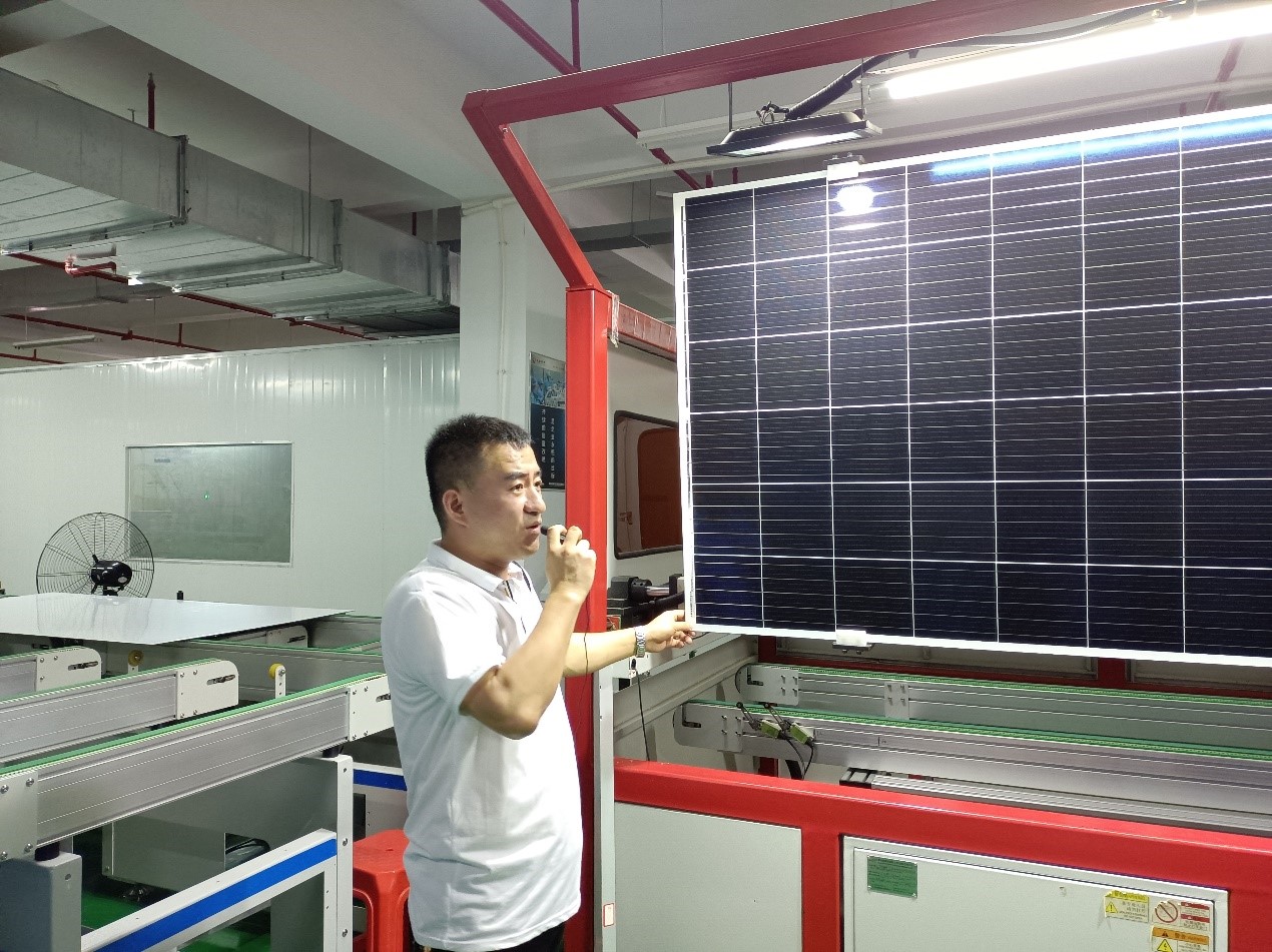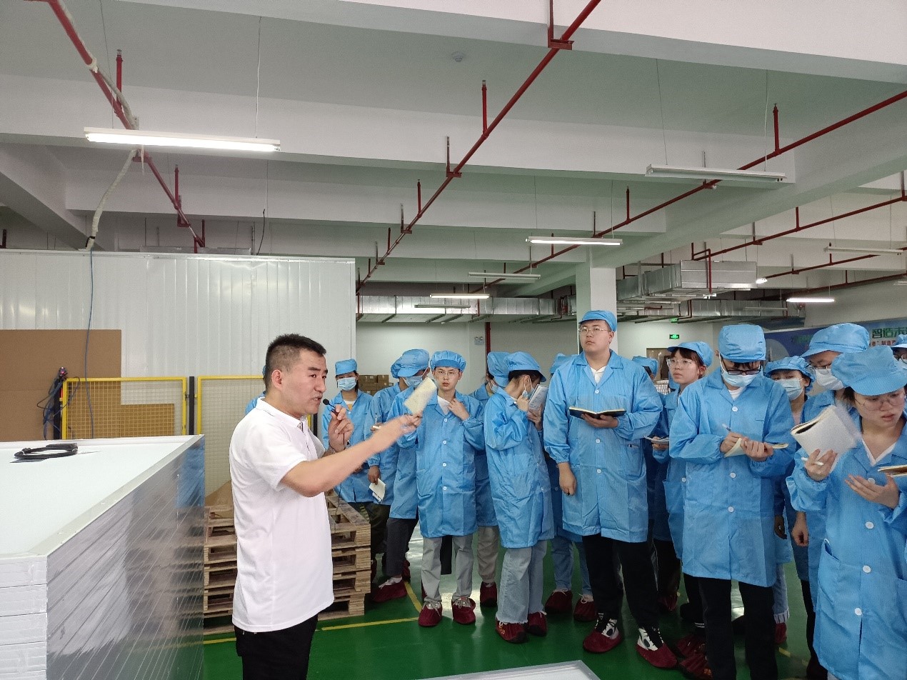 生产主管付志强随后在大会议室向学生们介绍了光伏组件生产流程、太阳能组件封装结构图、单多晶电池片原材料、太阳电池组装工艺简介,更加详细地讲解了串焊、叠层、翻转检、削边、装框、粘接接线盒、组件测试、高压测试等工艺的作用。