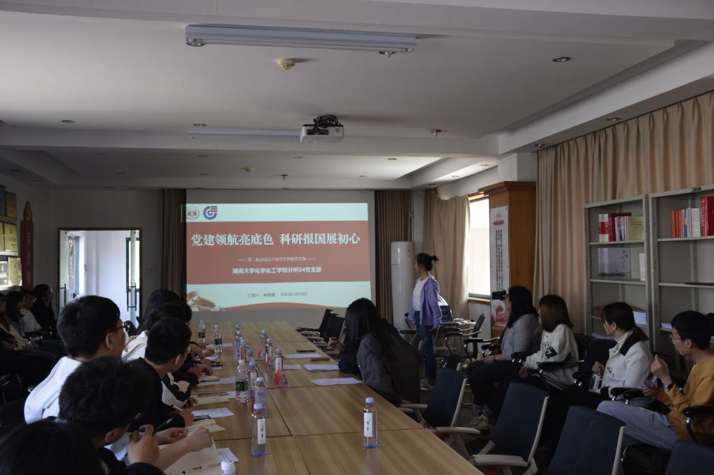 活动第一项,双方在湖南大学新化工楼D区党员活动室开展交流座谈会。会上,徐晓宇对兄弟院校的到访交流表示热烈欢迎!随后,戈明敏介绍了化学化工学院党建工作整体情况。分析04党支部书记杨艳霞同志以“党建领航亮底色,科研报国展初心”为主题介绍了支部的基本情况,向大家展示了以扎实的基本功底推动科研主业、以奋勇的支部品格助力疫情防控、以丰富的党日活动赋能活力党建的“全国样板党支部”。材料学院研究生支部副书记何张龙就支部基本情况、支部建设及支部风采进行介绍,最后,双方就如何充分调动不同年级的研究生党员积极性以及怎么发挥出研究生党员群体的特色等支部建设问题展开激烈讨论,总结汲取先进经验,大家纷纷表示本次座谈会有助于进一步夯实基层党建基础,提升支部建设质量,增进支部间友谊。