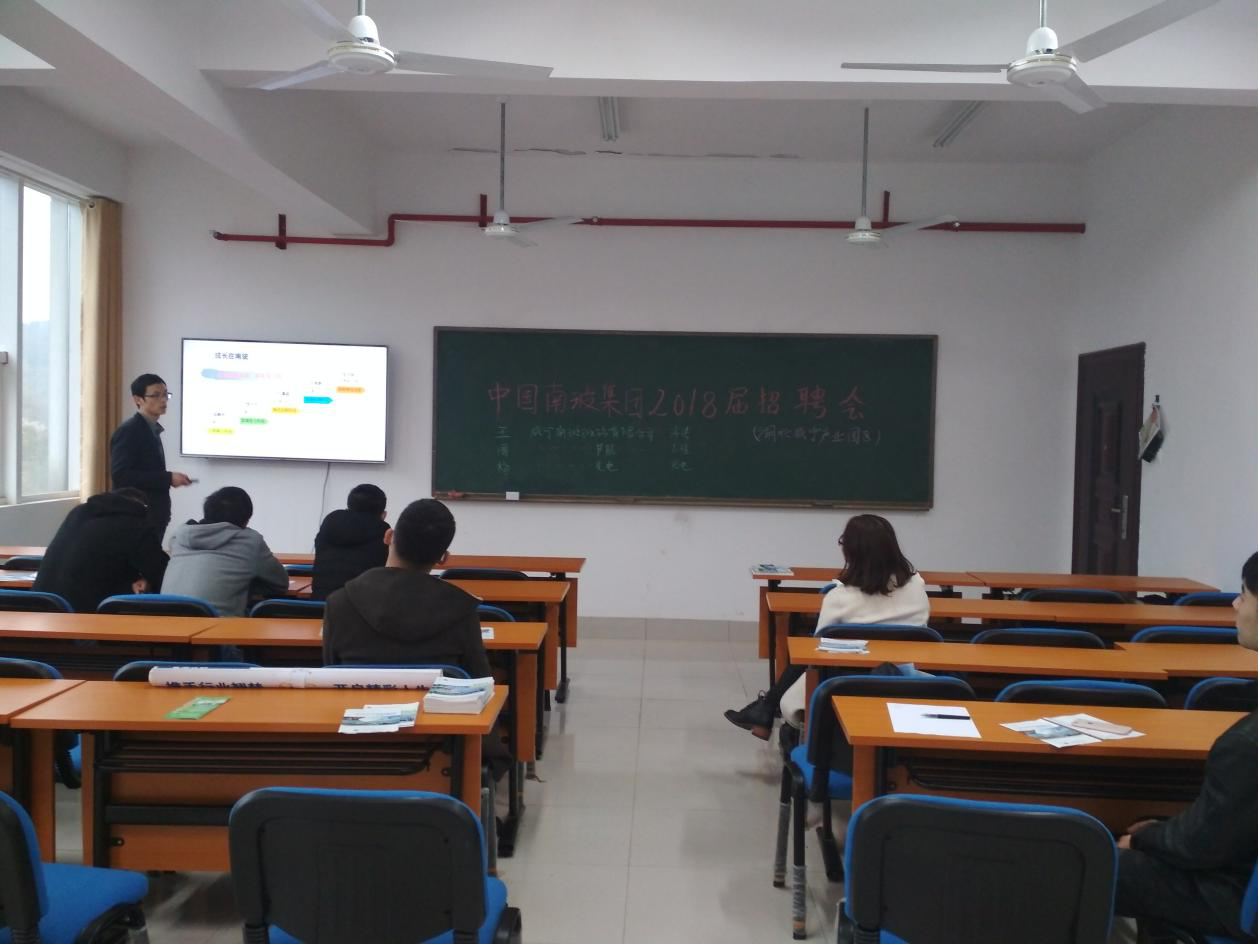 招聘会一开始先由南玻公司人事主管向毕业生们介绍南玻公司的发展历程,公司现在的规模,公司的目标和计划,接着着重介绍了公司提供的就业岗位及所需人才。宣讲会上毕业生们也积极主动地与公司人事进行良好的沟通交流,主要涉及薪资待遇,发展前景等核心问题。宣讲结束,同学们根据自身意向进行了简历投递。