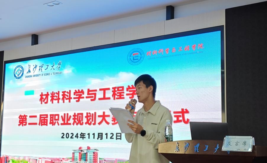 2024年11月12日下午,材料科学与工程学院在工科三号楼A307室举行第二届生涯规划大赛启动仪式。学院党委书记郑延恒、学院党委副书记邵巧艳、长沙岱勒新材料科技股份有限公司总经理段志勇、学院辅导员出席,本次活动由邵巧艳主持,各年级学生代表共300余人参加活动。