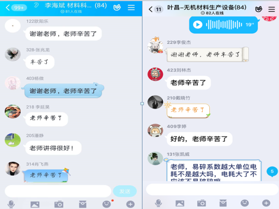 线上教学,对所有老师都是一场严峻的考验。为了获得最佳的教学效果,老师们一方面认真探索科学合理的线上教学模式,一方面积极响应教育部的号召,充分发掘优质网络教学资源,并在学院内部建立线上课程研讨群,积极开展线上教学研讨,按照“一课一案”的要求精心设计制定了线上教学方案。在开学前一天,第1-4周有教学任务的所有教师都完成了课程教学群的建设,完成了教学资料上传教学网络平台,调试好了线上教学的软件。今天是正式上课的第一天,夏清老师主讲的《无机材料工学》、叶昌老师主讲的《无机非金属材料工业生产设备》、李海斌老师主讲的《材料科研导论》、樊哲琼老师主讲的《材料物理性能》、龚丽老师主讲的《半导体物理基础》、丁美老师主讲的《材料科学进展A》、陈曙光老师主讲的《材料结构表征》以及罗文斌老师主讲的《清洁生产导论(自然科学)》均按计划开课,学生到课率平均达到97%以上,教学效果反响良好。对于湖北籍及疫情防控重点地区的学生要求主讲教师能够做到1对1的在线辅导。老师们课后及时在学院线上课程研讨群反馈教学信息,互献对策,取长补短。