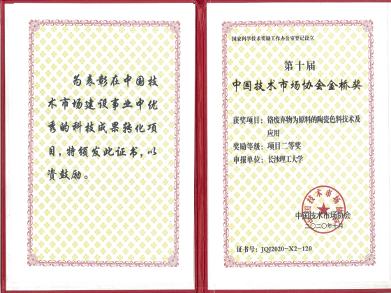 2020年10月22日,中国技术市场协会在山东淄博举办了第十届中国技术市场协会金桥奖表彰奖励大会,我院廖红卫色料团队主持完成的成果“铬废弃物为原料的陶瓷色料技术及应用”继第六届金桥奖后,再次荣获项目奖二等奖,项目第一完成人廖红卫作项目汇报,项目组成员詹文俊代表成果完成团队参加表彰奖励大会。近年来,廖红卫团队与广东佛山天宇陶瓷色料有限公司、江苏拜富科技有限公司等多家公司开展产学研合作,应用LETOU官网专利技术,就铬铁合铁制造陶瓷色料及高铬废弃物制造陶瓷色料核心技术产生了很好的社会、经济价值。其中近年来应用铬铁合金制造陶瓷技术生产的主打色料(黑色)占全球市场的60%以上,直接创造税利3亿元/年以上,经济效益及社会效益十分突出。