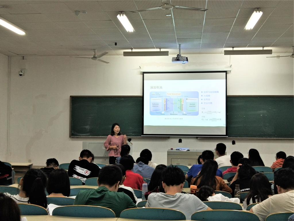 丁教授将介绍储能技术作为讲座的主要内容,使同学们能够更加了解储能技术,从现在国家对储能的重视切入主题,对机械储能、化学储能、电磁储能、相变储能一一进行介绍。在提到抽水储能技术时,丁教授用“返璞归真”来形容抽水储能在储能技术中不可缺失的作用;随后引入液流电池相关报告,介绍了液流电池的类型、工作原理和优势,同时介绍了液流电池的问题和挑战。在讲座的最后,丁教授对中国市场的未来、各种储能技术的未来进行了预测。