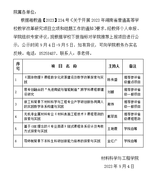 材料学院2023年教学改革研究项目推荐名单公示