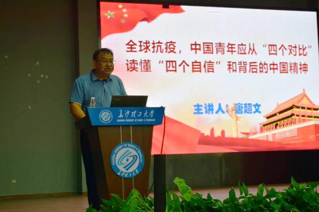 唐超文书记从五个方面进行了阐述,首先,我们要有“只有中国特色社会主义才能发展中国”的道路自信,我们坚持以人民为中心、坚持问题倒逼改革和坚持党是领导一切,我们的道路才能越走越宽广、越平坦和越坚定。其次,我们要有“新时代呼唤新思想,新思想引领新时代”的理论自信,从全球抗击新冠疫情的角度,我们的国家安全观越来越得到全国民众的支持拥戴,开放的发展理念越来越受到国际社会青睐,构建人类命运共同体的理念越来越得到各国政要认同。再次,我们要有“鞋子合不合脚,只有自己穿了才知道”的制度自信,我们能全民同心,群策群力,充分体现了我们的政治制度、组织体制和民主机制优势。与此同时,我们还要有“只有坚守中华文化立场,不忘本来、面向未来、吸收外来,才能屹立于世界之林”的文化自信,我们的文化源远流长、百经锤炼、兼容并蓄、百花齐放,值得自信。我们中国人民在抗击新冠疫情中产生的自强不息、愈挫愈勇的中国精神也让我们越来越自信。最后,唐超文书记向在场的全体同学们传达了学校第四次党代会精神,并勉励同学们要与时代共同前进,心怀崇高理想,爱国爱校并要付诸行动,为将LETOU体育平台建设成为“百强”大学而共同奋斗。