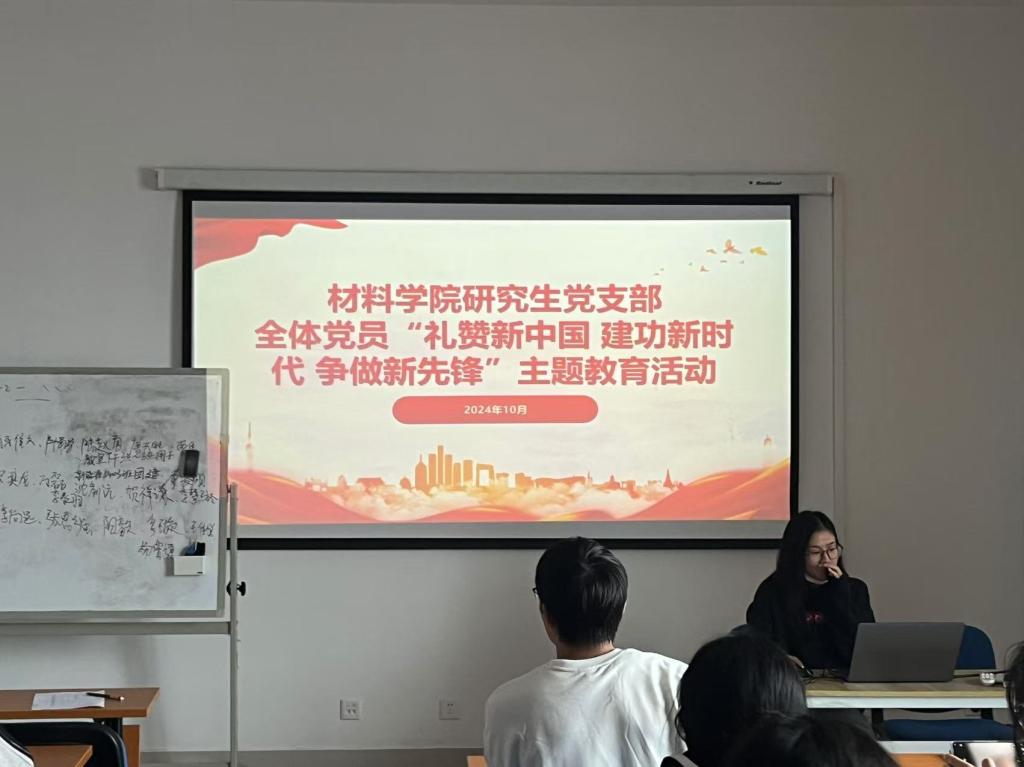 为认真学习习近平在庆祝中华人民共和国成立75周年招待会上的讲话精神和深入学习贯彻党的二十届三中全会精神。材料科学与工程学院研究生党支部于10月28日在新能源一栋804室开展“礼赞新中国,建功新时代,争做新先锋”主题党日活动。会议由支部副书记黄玉主持,全体党支部成员参加。