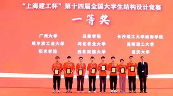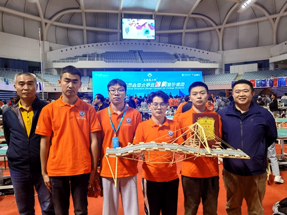 我院参赛选手充分利用暑假的积极备赛训练,在土木学院副院长付果老师的悉心指导下确定了最佳的设计方案,取得了理想的效果。在国赛过程中,城南学院党委书记李修春亲自领队鼓舞士气。最终,城南学子经过16.5小时的现场模型制作、加载测试比赛、专家打分和陈述答辩等环节,模型承受静荷载65kg、移动荷载5kg,总成绩为73.54分,夺得全国一等奖。