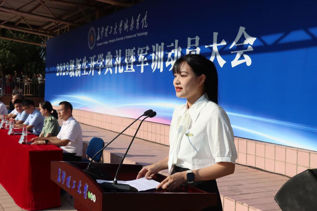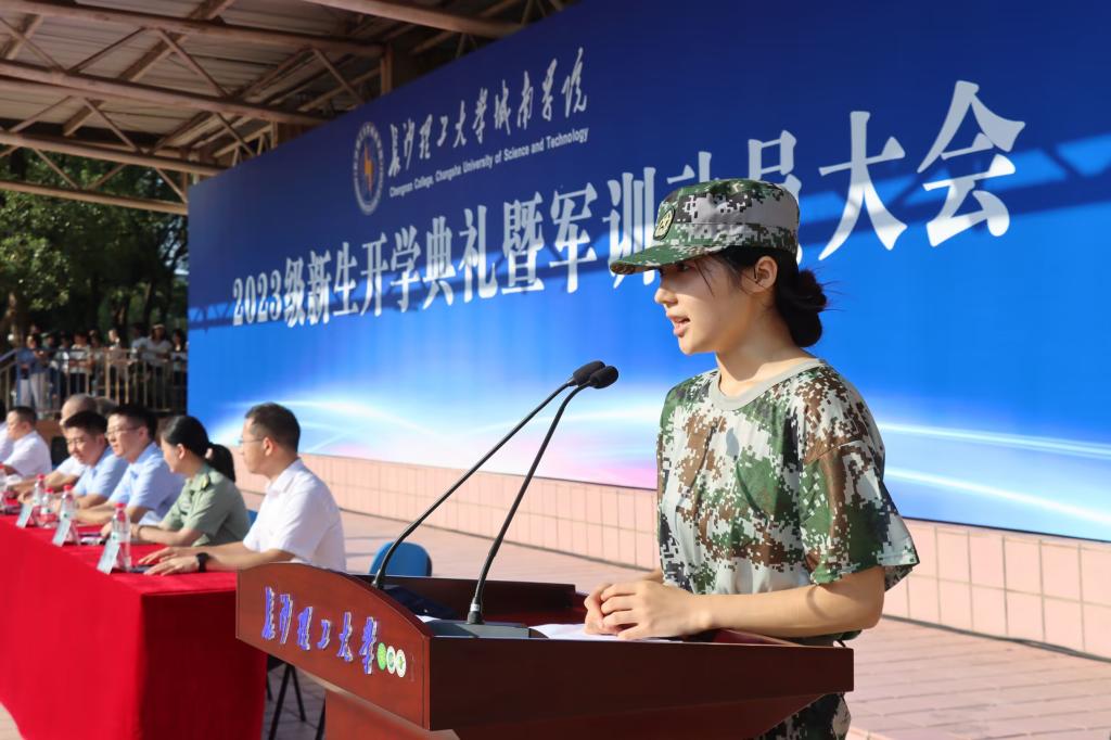 新生代表、交通土建系物流2301班田蕊馨同学代表全体新生感谢了为他们成长付出辛勤劳动的父母和老师,对于新的身份转变她表示要尽快确立新的学习生活目标,作为新生力量不断提高思想高度,拓展视野的宽度,在军训的日子里互帮互助,超越自己。最后全场新生铿锵有力地高呼“请党放心,强国有我”的八字誓言,响亮的青春誓言在田径场上空久久回荡。
