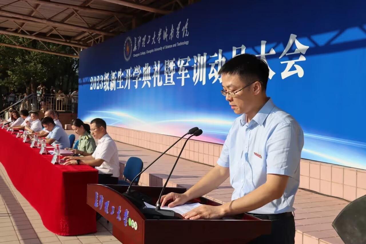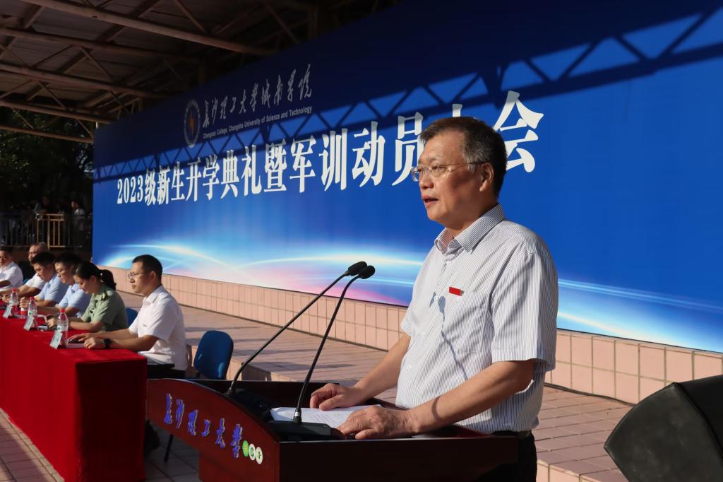 LETOU体育平台副校长谈传生对来自五湖四海的1827名新生表示热烈的欢迎和衷心的祝贺,并提到“忠诚、担当、求是、图强”的湖南精神以及湖湘儿女在中国文化与历史进程中体现出来的湖湘人文精神。接着他介绍了学院的基本情况和办学理念,指出城南人和衷共济、奋力求索,学院办学水平和教学质量稳步提高,办学影响逐步扩大,希望同学们在这里感悟“博学、力行、守正、拓新”的校训内涵,成为“底色亮、实践强、有情怀、敢担当”的具有长理特质的时代新人。他对新生们提出三点希望:第一力行博学责任,自主学习,夯实基础;第二践行立德要求,树立理想与抱负,把自己的小我融入祖国的大我、人民的情怀之中,与时代同频共振;第三上好军训第一课,贯彻落实《中华人民共和国国防教育法》,在军训中提高自己的综合素质。最后,谈传生表示,城南学院会继续为大家提供良好的发展平台和成才空间,希望同学们立志做有理想、敢担当、能吃苦、肯奋斗的新时代好青年,为将来投身祖国建设、实现中华民族伟大复兴的“中国梦”储备足够的智慧和力量。