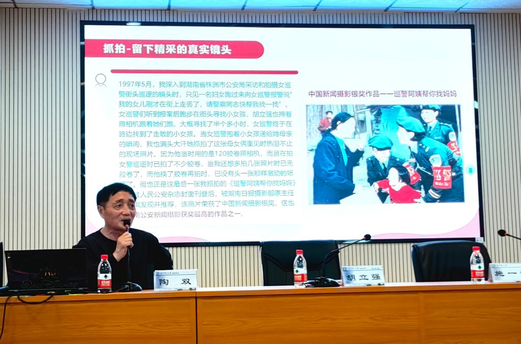 胡立强曾任人民公安报社驻湖南省公安厅记者站站长,曾获中国人大新闻一等奖、中国新闻摄影银奖。讲座中他为大家展示了大量优秀的作品,从新闻摄影的体会与思考展开讲座:在进行新闻摄影时既要讲政治,又要讲艺术,要围绕当前工作重心及下基层活动的典型来抓拍;在进行新闻摄影时还要讲原则,要追求真实性与时效性;要培养自己有一双能发现美的眼睛,选择独特角度或利用其它物体来衬托主题。