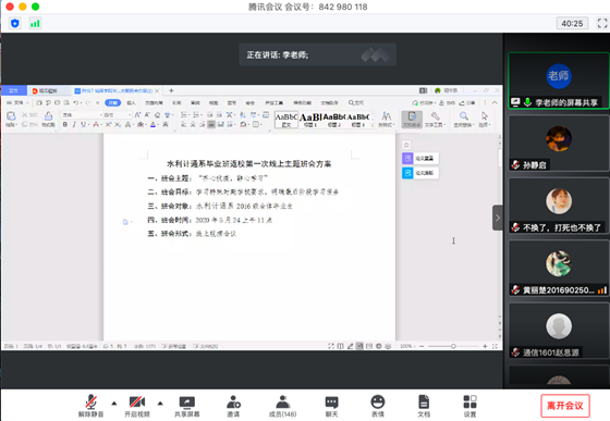 为做好疫情期间学生的思想引领工作,进一步加强毕业生返校后的教育管理,5月24日上午11点,水利计通系李琳老师与各毕业班学生线上开展了“齐心抗疫 静心学习”主题班会活动。