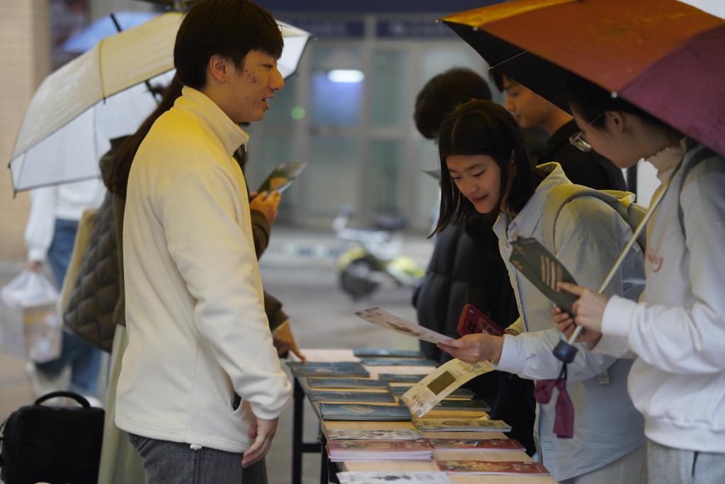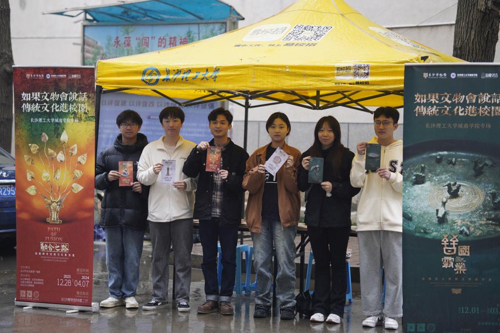 活动现场准备3000余份活页宣传单,向同学们免费发放。宣传单正反两面均印有制作精美、历史悠久的文物图片,还可免费扫码收听文物故事。本批文物由长沙博物馆联合山西博物院以及大同市博物馆、内蒙古博物院、洛阳博物馆、呼伦贝尔博物院共同举办,在长沙博物馆限时展出。现场人潮涌动,同学们纷纷驻足询问并精心挑选自己喜欢的文物图片。