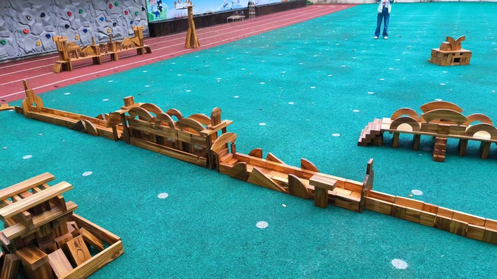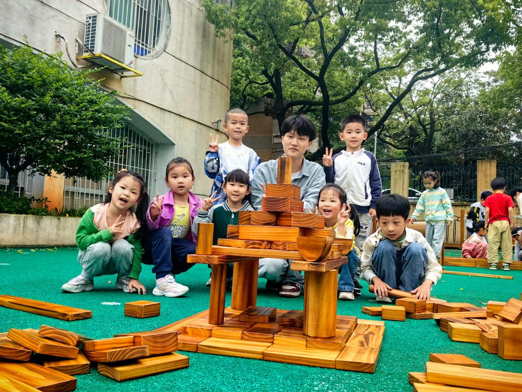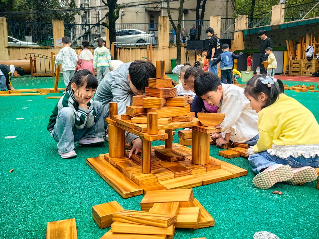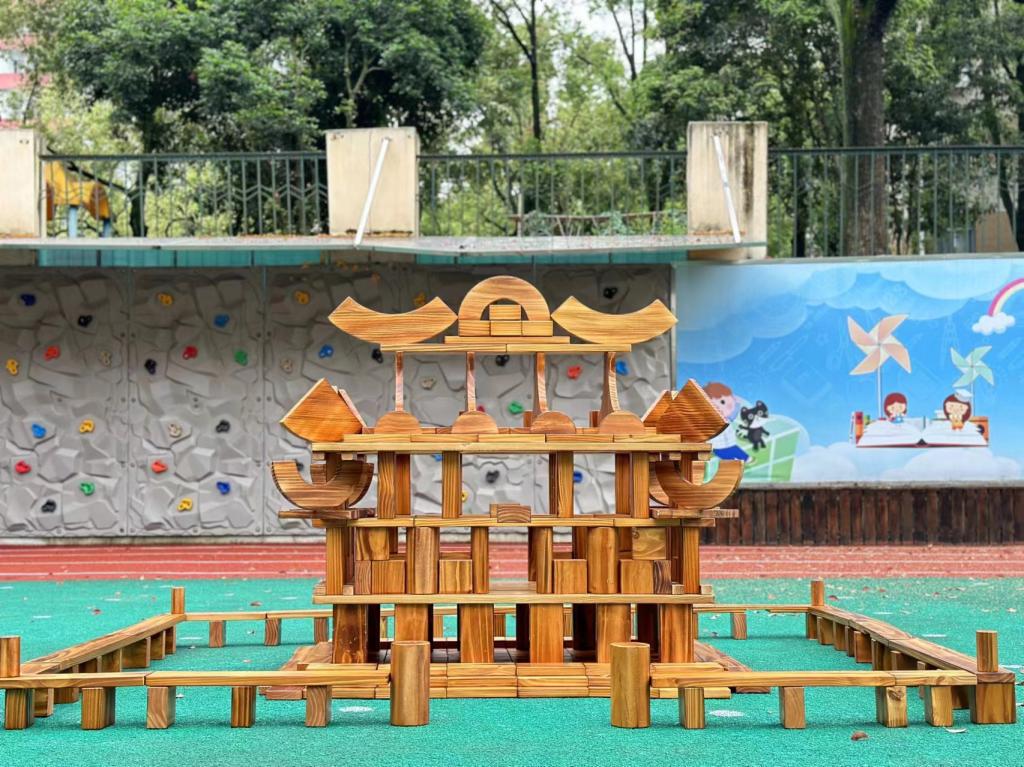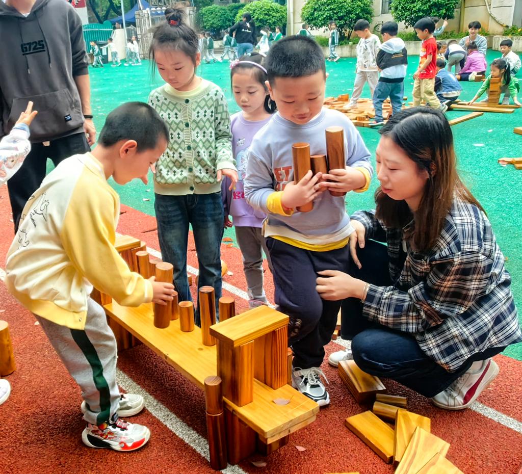 赛前,科创基地成员朱秀鑫、刘炬、谢瑞国、覃睿妍、黄亮、谢康带来比赛获奖模型,以通俗、童趣的方式向小朋友们讲解模型的设计原理及过程,并用幼儿园积木示范如何搭建模型。幼儿园胡敏老师将比赛队伍分为5组,在6位科创基地成员的耐心指导和帮助下,小朋友们搭建完成了“杜甫江阁”“桥梁”“水塔”“体育馆”“教学楼”等建筑模型。