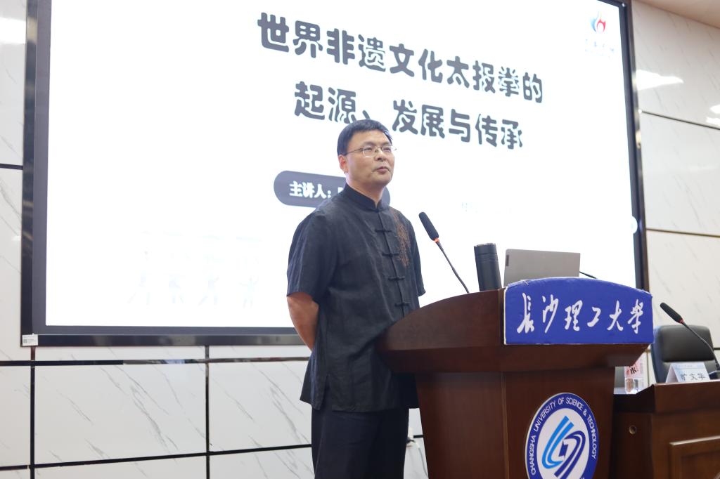 讲座尾声,他对太极拳的未来进行展望,阐述了太极拳在数字时代下应该如何传承与创新,并号召师生一起以"文化使者"的担当共同守护非遗瑰宝。