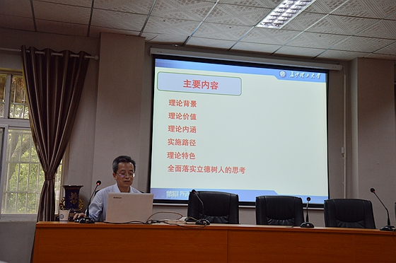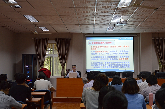 在此基础上,他结合学院实际,围绕全面落实立德树人,做了“学习习近平新时代中国特色社会主义思想、习立德树人”的专题分析和部署。他要求,认真学习领会习近平教育思想精神;加强管理队伍建设,提高干部队伍素质;树立正确中心意识,坚持育人为本、德育为先原则;持之以恒加强学风建设;全面推进“五育人”工作。