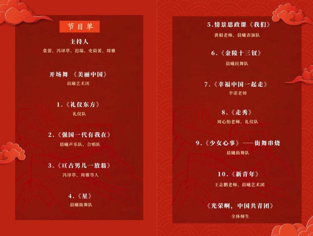 晚会在开场舞《美丽中国》中拉开帷幕。演出现场从优雅知性的礼仪操到深情的歌曲演唱,从铿锵有力的古诗朗诵到致敬先烈的舞蹈,都彰显了城南师生朝气蓬勃、奋发向上的精神风貌和为国奉献的坚定信念。师生共同演唱的《新青年》气宇轩昂,将现场气氛推向高潮。最后,全场起立,台上台下共唱《光荣啊,中国共青团》,持旗者挥舞着院旗、系旗,晚会在千人合唱中圆满落幕。
