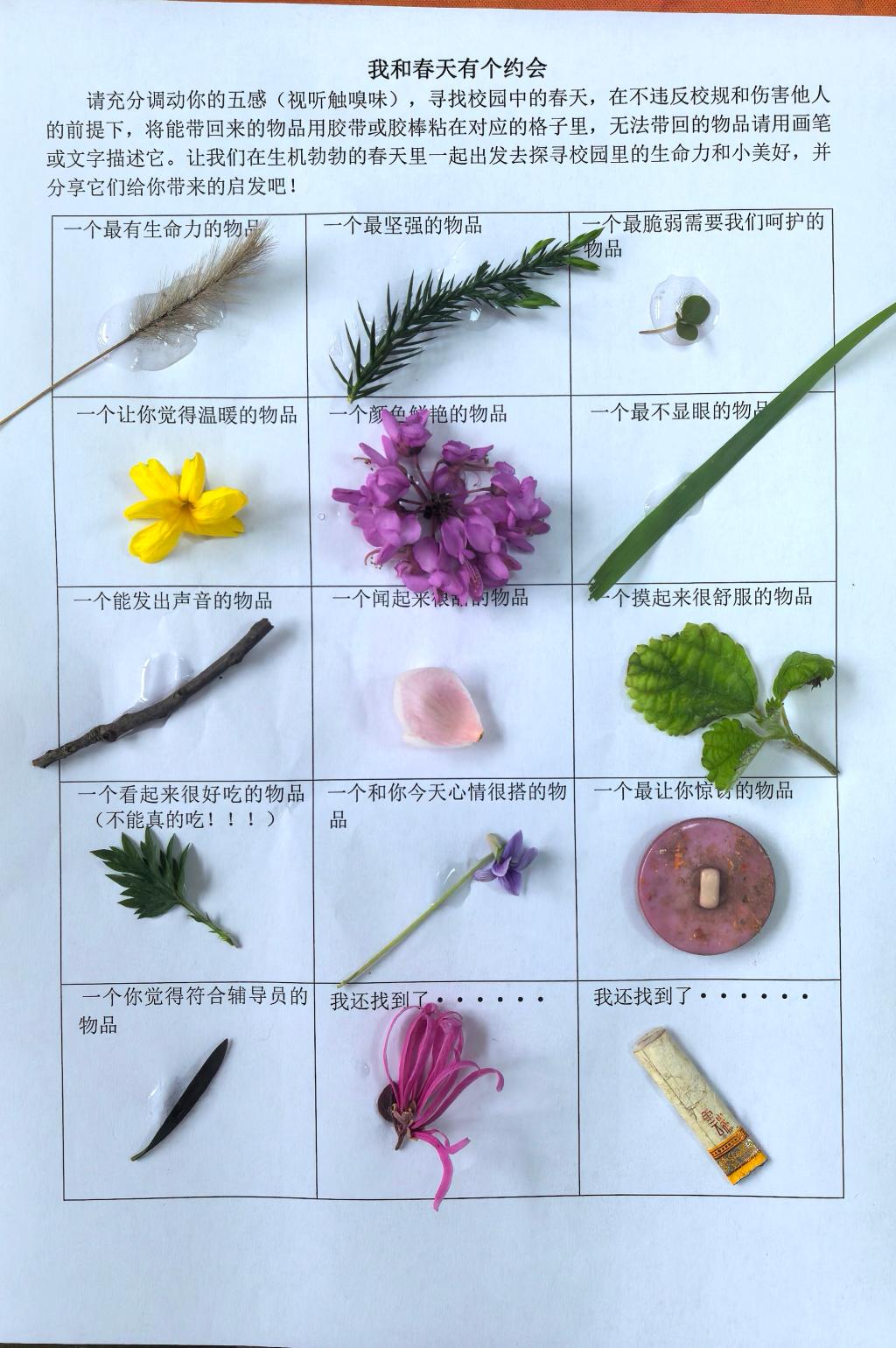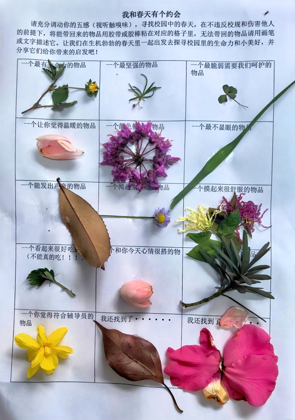 活动伊始,心建部为参与者发放了特制表格,内容涵盖“你觉得很坚强的物品”等多个独特视角,鼓励同学们从不同感官和情感角度去观察春天。在活动过程中,同学们不仅专注于个体观察,还积极展开交流讨论,通过多角度记录和探寻自然细节,不断在观察中触发思考,在思考中探索自我内心。