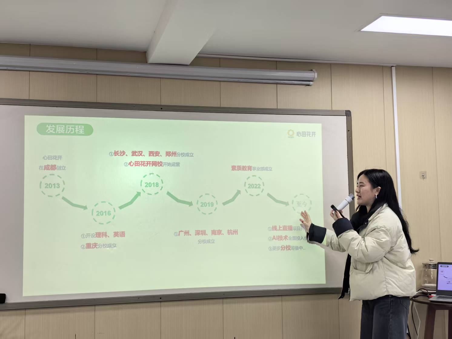 心田花开长沙分校相关工作负责人杨婵对城南学院老师们的到访表示热烈欢迎,并详细介绍“心田花开”在教学管理、课程研发、教师培训等方面的先进经验。她表示,心田花开非常欢迎城南学院的优秀学子们加入,并特别介绍了在“心田花开”多位城南学院的优秀校友。