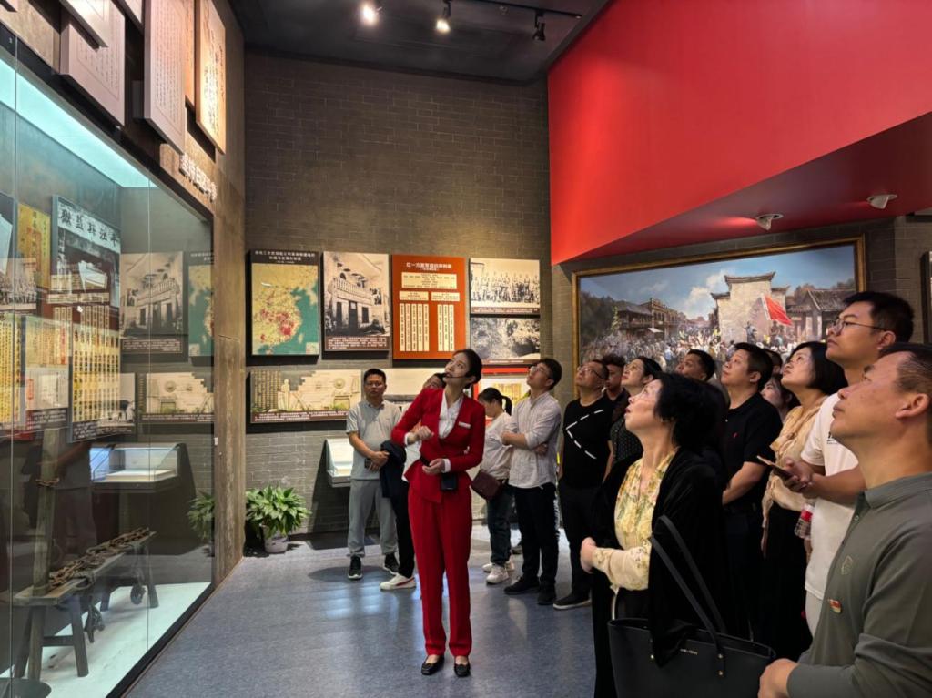 在现场,大家认真聆听讲解,或抬头凝望,或驻足拍照记录。在陈列馆序厅,预备党员面向中国共产党党旗,举起右拳庄严宣誓。
