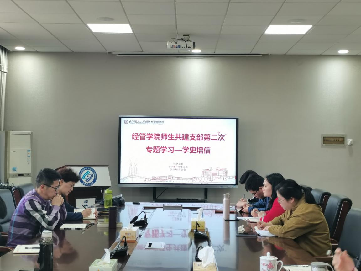 4月30日上午,行政支部和学生党支部会计一支部在文科楼D202会议室共同开展师生共建主题党日活动。活动主题为党史学习教育—“学史增信”。师生党员共20余人参加。