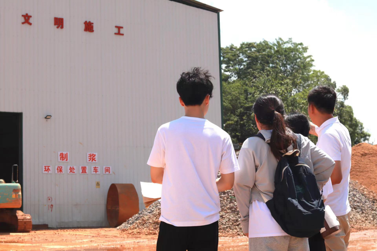 项目负责人带领实践团成员们参观过程中介绍到,地下充填工程采用超高水材料采空区开放式填充法,矿业单位收容工程建设所产生的工程渣土,通过机器将渣土中所含砂石、石料及杂质分离,再与水混合制浆,不对采空区进行任何调控,利用浆液的流动性和采空区高差压力直接灌入并固结形成填充体的方式完成治理。同时,利用截排水系统和原水仓预埋排水系统加强排水,减少水土流失。
