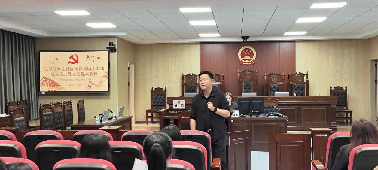 2024年9月,法学院成立了学生社区普法一站式社区,为了充分发挥党建引领作用,把支部建在学生社区,10月29日下午,学院在四教模拟法庭召开学生社区法律援助党支部成立仪式暨支委选举大会,共有22名学生党员参会。会议由罗佳怡主持,学院党委副书记汪伦、辅导员曾宇欣出席会议。