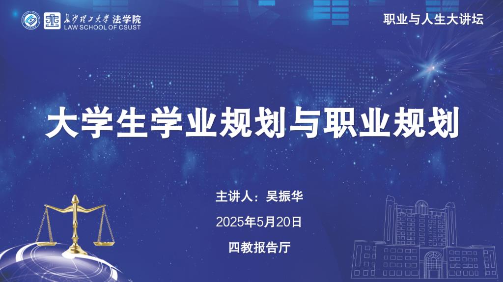 5月20日下午,LETOU体育平台法学院在4号教学楼报告厅举办职业与人生大讲坛。本次讲座以“大学生学业规划与职业规划”为题,湖南省商务厅培训中心讲师吴振华担任主讲人。学院研究生、本科生代表参加。