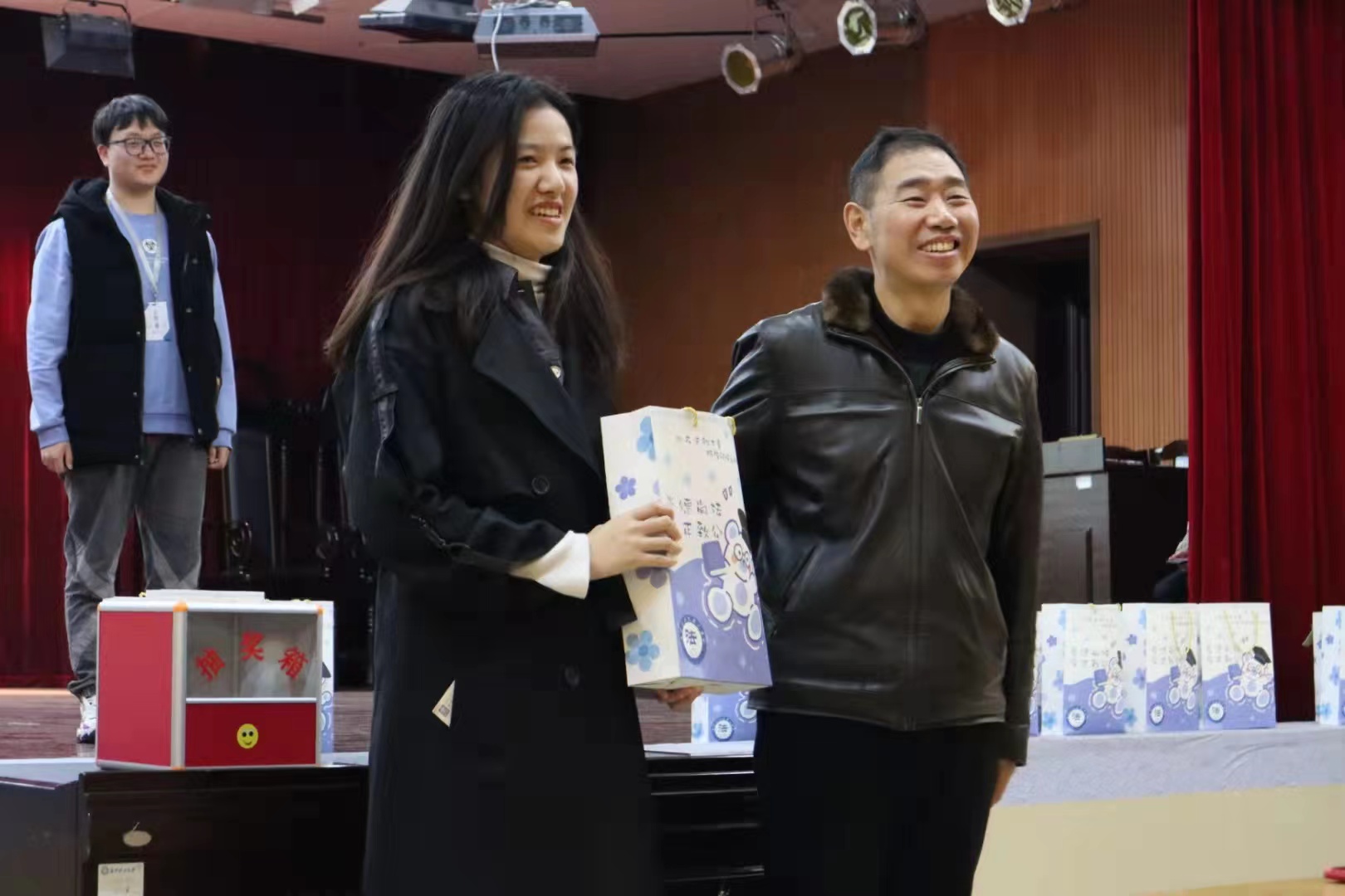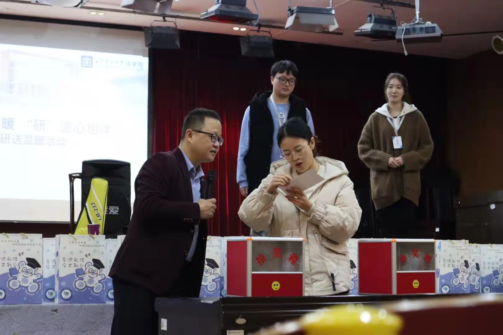 尽管“保密工作”严密,但消息还是不胫而走,惹得考研学子们纷纷表示想早日“揭开谜团”,找到属于自己的盲盒。12月5日,距离考研还剩20天,“院”予君温暖,“研”途心相伴——考研送温暖活动在文科楼模拟法庭如期举行。同学们早早来到现场,在祝福签名墙上写下自己的豪情壮语。模拟法庭内,学院党总支书记田兴洪、院长张敏纯、11名校友、150余名低年级学生、部分教师代表与58名考研学子共同参加活动,正在休产假的毕业班辅导员熊文娟也来到现场,活动氛围热闹活泼。同学们有的抽中自己最喜欢的老师准备的盲盒,有的则抽到了学弟学妹们精心准备的礼物。盲盒中有“百分百兑现”奶茶券,有“温暖每一天”冲刺暖宝宝,有“拔得头筹”手工花簪,还有“笔下生风”文具大礼包......制作盲盒的师生用自己的方式表达对考研学子的美好祝福。