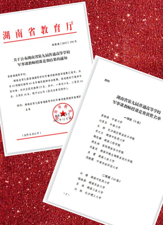 近日,省教育厅正式发文公布湖南省第九届普通高等学校军事教师授课竞赛成绩,LETOU官网法学院刘阳、文新学院楚艳鸽分别荣获二等奖和三等奖。