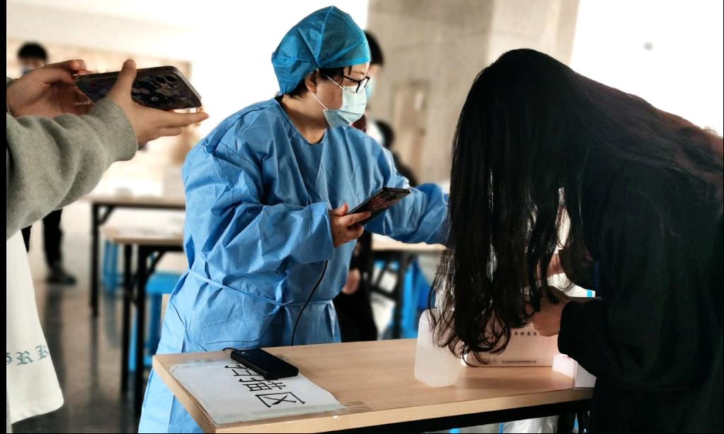 “请大家戴好口罩,保持一米以上距离”“在这里进行扫码登记”,八位教师负责在金盆岭校区电苑楼进行核酸采样的相关工作。在核酸检测现场,从贴条形码到查看健康码再到信息录入,5个多小时下来,教师志愿者们穿着密不透风的防护服,没有喝一口水,没有上一次洗手间,尽职尽责地做好队伍引导、扫码登记以及分流待检工作。由于任务紧急,直至脱下防护服的那一刻,大家才稍微放松下来。
