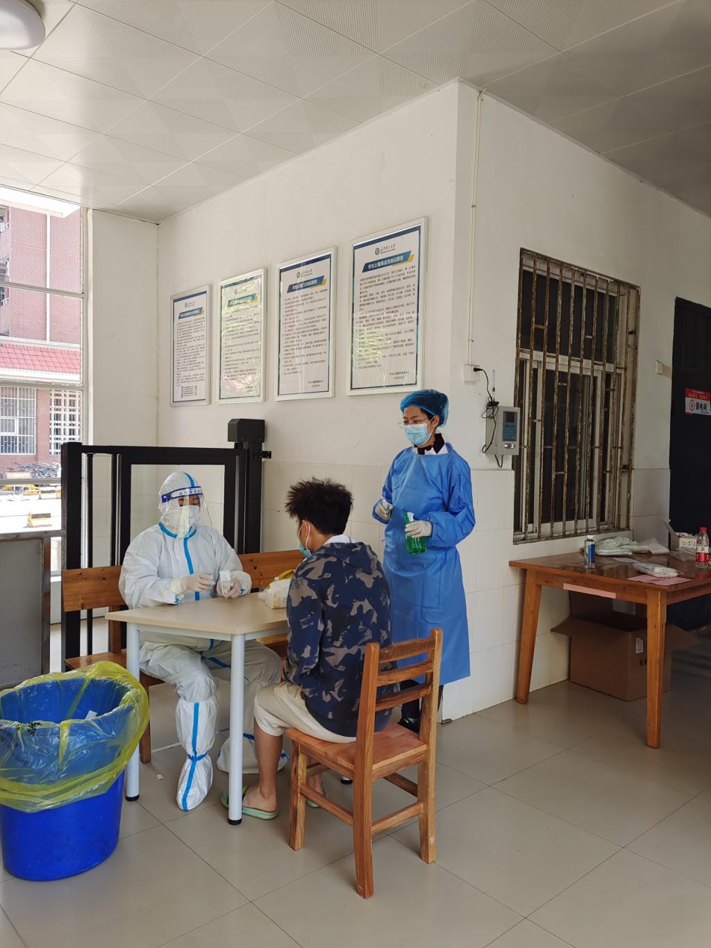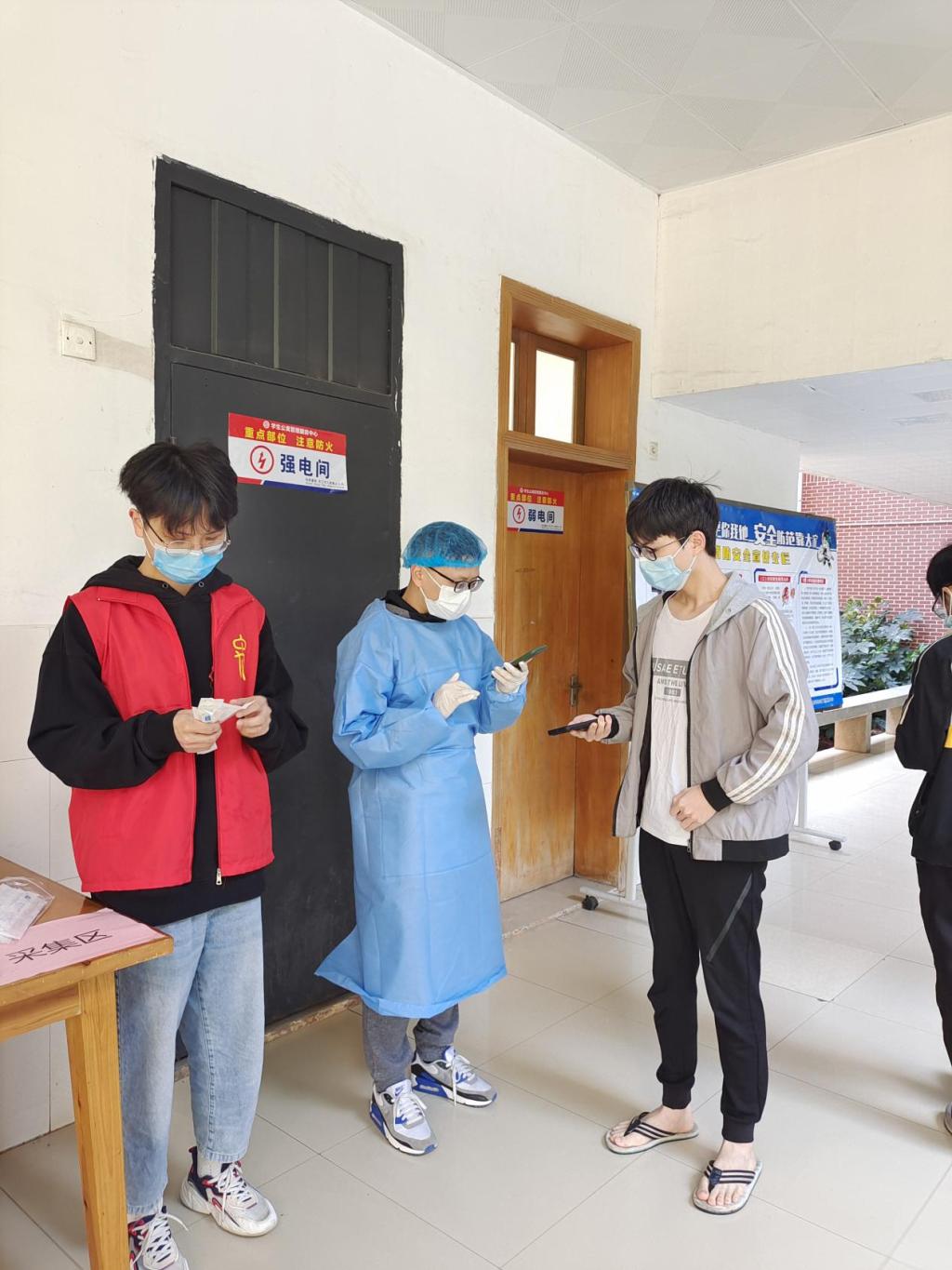 在接受医护人员简单的现场培训指导之后,三位教师立刻穿上厚重的防护服,投入到现场协助核酸检测的工作之中,有的负责进行扫码录入信息,有的负责进行核酸检测地点消毒,大家分工合作,互相配合。五个小时下来,教师志愿者们没有坐下一刻,没有喝一口水。由于天气已逐渐炎热,厚重的防护服内早已是汗如雨下,但是大家始终全身心投入核酸检测工作,毫无怨言,毫不退缩!同时,在现场其他教师和学生志愿者共同指挥疏导下,核酸检测现场秩序井然,有条不紊,参加核酸检测的同学们也纷纷向各位志愿者教师竖起大拇指表示衷心感谢。