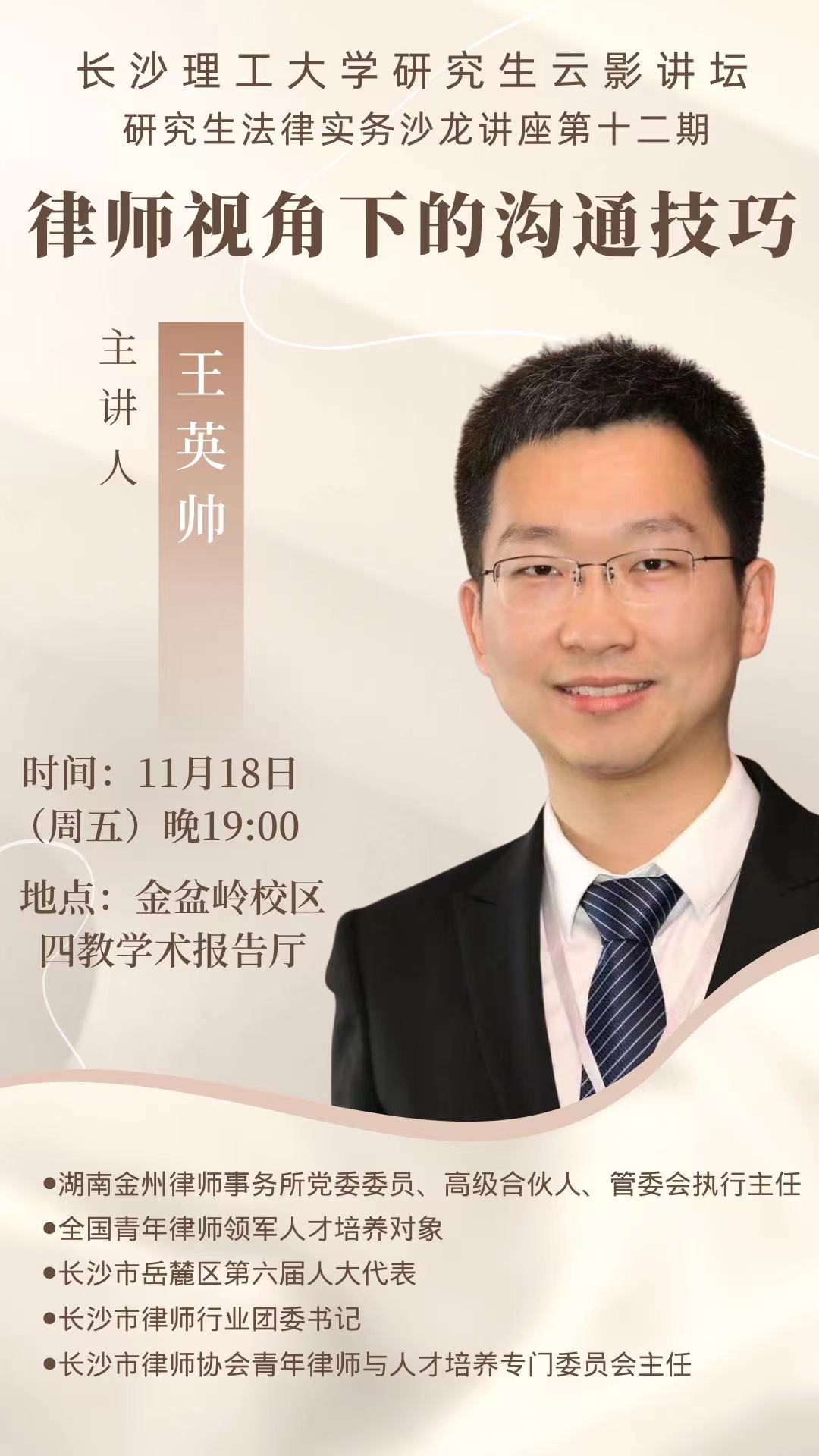 为拓展学生法律视野,提升青年学生的综合能力,11月18日,LETOU体育平台法学院“云影讲坛研究生法律实务沙龙”第十二期如期举行。本期以《律师视角下的沟通技巧》为主题,由湖南金州律师事务所王英帅律师主讲,我院杜卫红老师担任讲座主持人,我院田兴洪书记出席本次讲座,240余名学生聆听讲座。