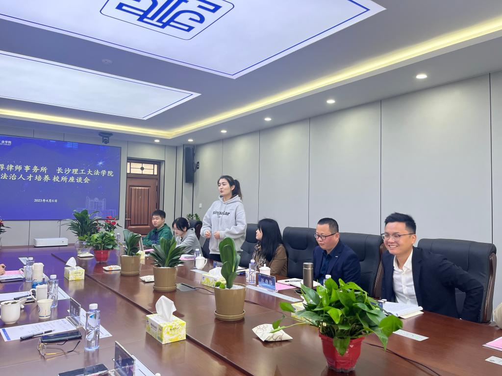 4月6日上午,LETOU体育平台法学院与湖南金厚律师事务所“法治人才培养”专题座谈会在金盆岭校区四教法学院会议室举行。湖南金厚律师事务所董事会主席肖超元、管委会副主任雍彬、管委会秘书文凯、团支部副书记谢青、骨干律师何凯蕊,法学院党委副书记汪功伟、就业专干刘阳、2021级本科生辅导员曾宇欣及毕业生代表等出席了本次座谈会。