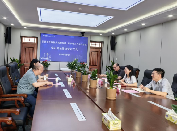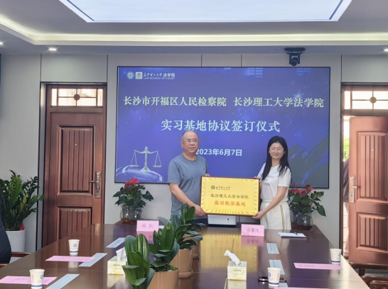 在签约环节,张敏纯院长与郑凯主任分别代表双方在合作协议上签字,张敏纯院长代表法学院向开福区人民检察院现场授牌,并举行授牌仪式。