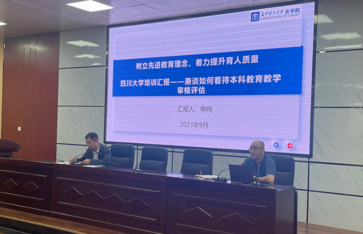 申纯从“培训基本情况”、“培训的心得体会”、“对今后教学工作的启示”三个方面分享了培训收获,并提出四川大学先进的教育管理及教学创新的理念与做法,对于法学院今后的教学和人才培养工作,特别是即将来临的本科教育教学审核评估有着重大的指导意义。我们要认真学习川大对一流拔尖创新人才培养的一些典型做法,学以致用,内化为我院建设与发展的强大动力和具体举措。同时提高思想认识,转变发展观念,强化学术型人才创新能力方面的培养,在工作中真抓实干,落细落小,打造一支有情怀的师资队伍和一批高质量的课堂教学,不断推进学院高质量发展,为学校决胜建成百强大学贡献力量!(文/李博文  图/袁林  审/申纯)