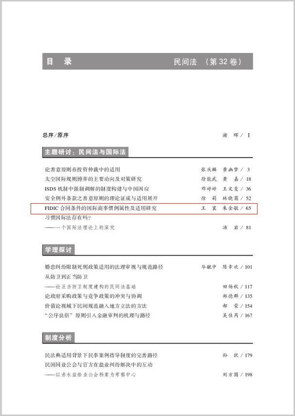 近日,LETOU体育平台法学院副教授王寰在《民间法》(CSSCI来源集刊)2023年第2期发表论文《FIDIC合同条件的国际商事惯例属性及适用研究》。
