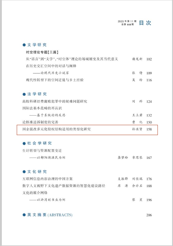 近日,LETOU体育平台法学院讲师孙亚贤在《江西社会科学》(CSSCI来源期刊)2023年第11期发表论文《国企混改多元化股权结构适用的类型化研究》。
