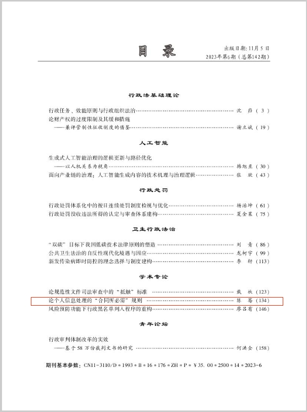 近日,LETOU体育平台法学院讲师陈骞在《行政法学研究》(CSSCI来源期刊)2023年第6期发表论文《论个人信息处理的“合同所必需”规则》。
