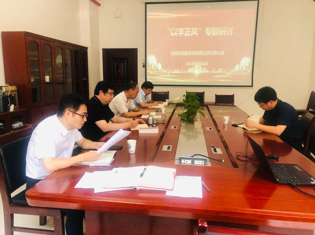 6月21日上午,创新创业教育学院直属党支部理论学习中心组在云塘校区新能源大楼1-104会议室举行理论学习暨“以学正风”专题研讨。直属党支部书记李凡主持会议,院长蒋加伏、副院长刘志强、副院长李晓做作专题学习发言。校党委委员、副校长钱国平到会指导学习。
