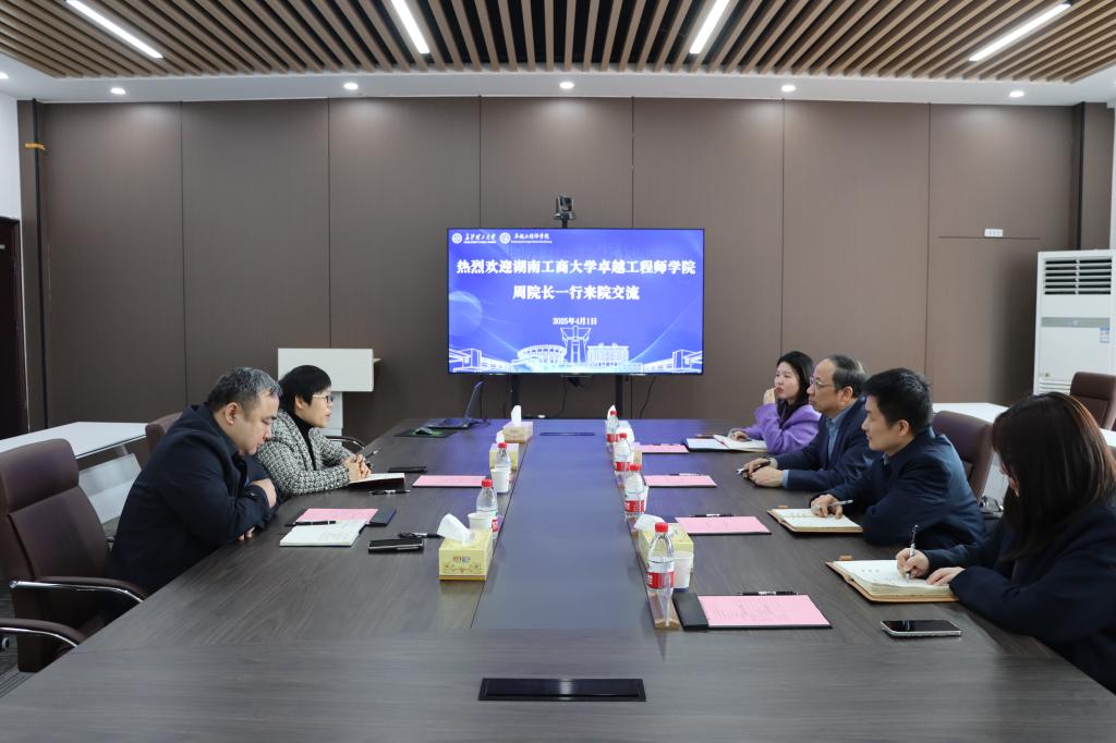 4月1日上午,湖南工商大学卓越工程师学院执行院长周鲜成、副院长谭平一行4人来院调研交流。院长韩艳、副院长吴钢参加会议。会议由韩艳主持。