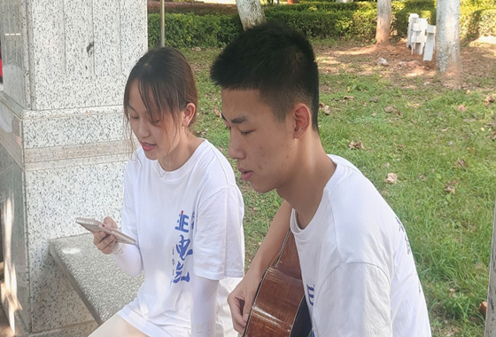为让实践队员们以更加饱满的精神状态合唱红歌,展示电气学子的昂扬斗志,同时促进实践队员们的交流以增进感情,实践队队长李豪、武智雄提议进行几个小游戏。实践队员们按照工作分四组先后进行“爱的抱抱”、“逢三必过”小游戏,采取积分制形式进行奖惩。实践队员彭泓林、翟晓燕进行吉他弹唱歌曲《晴天》将氛围推向高潮。随后,实践队员们开始进行红歌合唱,行人纷纷驻足观看,合唱完毕后,实践队员们在公园花坛前进行合影留念。