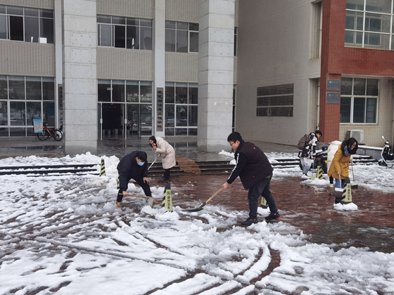 学工办老师们一同投入到志愿扫雪行动中来,带领大家全力以赴清扫积雪。扫雪过程中,老师和同学们不畏严寒、齐心协力、互相帮助、干劲十足,大约一个小时后,楼栋附近以及周围道路上的积雪结冰已经基本被清扫干净,为师生的活动与安全提供了有力保障。