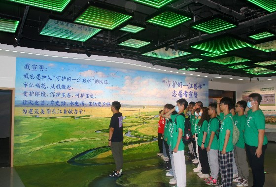 一入公园,荷花的清香扑面而来,为夏日燥热消减,沁人心脾。广场内摆满从荷叶中盛开的莲花,随风摇曳。往里走,经过一条青石小路,沿岸的垂柳与池中莲蓬相荡漾,激起风波,水纹。穿过这一条荫蔽,队员们登上游湖的船只,夏日微风将游船吹向湖中央,荷花与荷叶相互交错,将船只包围,在夏日的照射下有一番“接天莲叶无穷碧,映日荷花别样红”的韵味。随后,队员们和公司领导一起参观了“守护好一江碧水”展陈馆。作为岳阳市党员干部“守护好一江碧水”教育基地,该展陈馆与江豚湾隔堤相望,紧靠长江岸线马拉松赛道,以“守护好一江碧水、创建人类文明新形态”为主题,分为“长江:母亲之河”“总书记情系长江”“守护好一江碧水”“逐梦·人类文明新形态”4个篇章,展现岳阳流水绕城、大江大湖的生态底色。在展陈馆,队员们看到了很多洞庭湖和长江流域曾经存在的环境污染问题,也看到了很多可敬的环保卫士响应习近平主席号召为保护环境做出的伟大贡献,以及现今已取得的成就,习近平总书记指出:“生态环境保护和经济发展不是矛盾对立的关系,而是辩证统一的关系。只有把绿色发展的底色铺好,才会有今后发展的高歌猛进。”我们深刻认识到了保护环境的重要性,并在胥书记的带领下进行了加入“守护好一江碧水”志愿者的庄严宣誓。