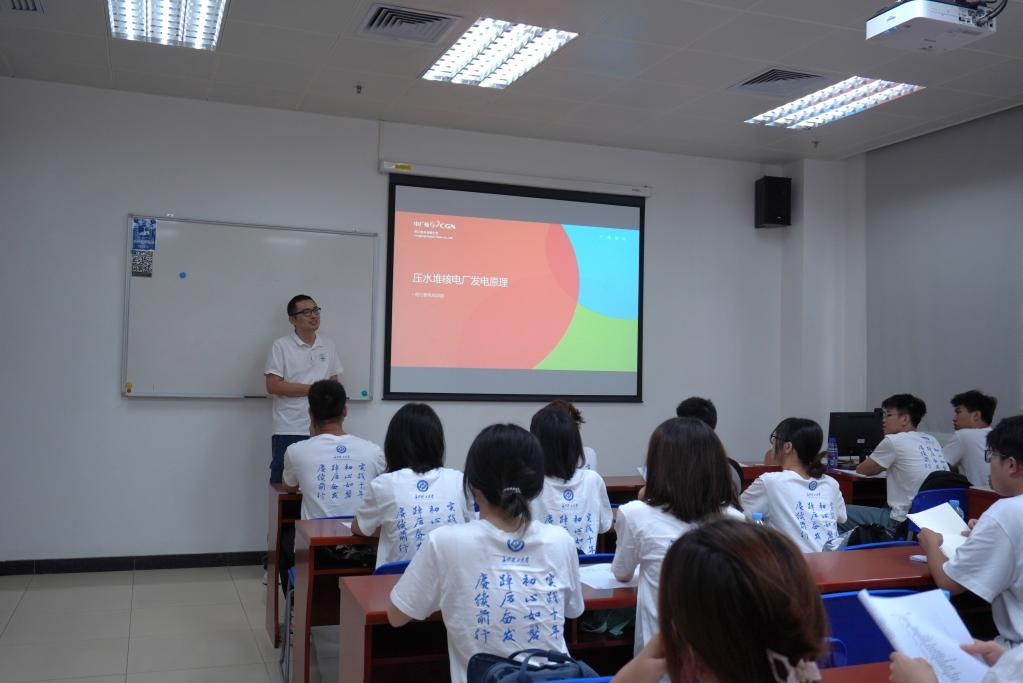 下午2点,实践团在培训中心开展了核电知识入门课堂。主讲乔旭晨老师为实践团带来了“压水堆核电厂发电原理”一课。乔老师通过生动有趣的语言和严谨的逻辑向成员们展示了核电的稳定性与持续性等知识。实践队员们认真听讲,积极回应,透露出他们对核电的好奇与敬畏。