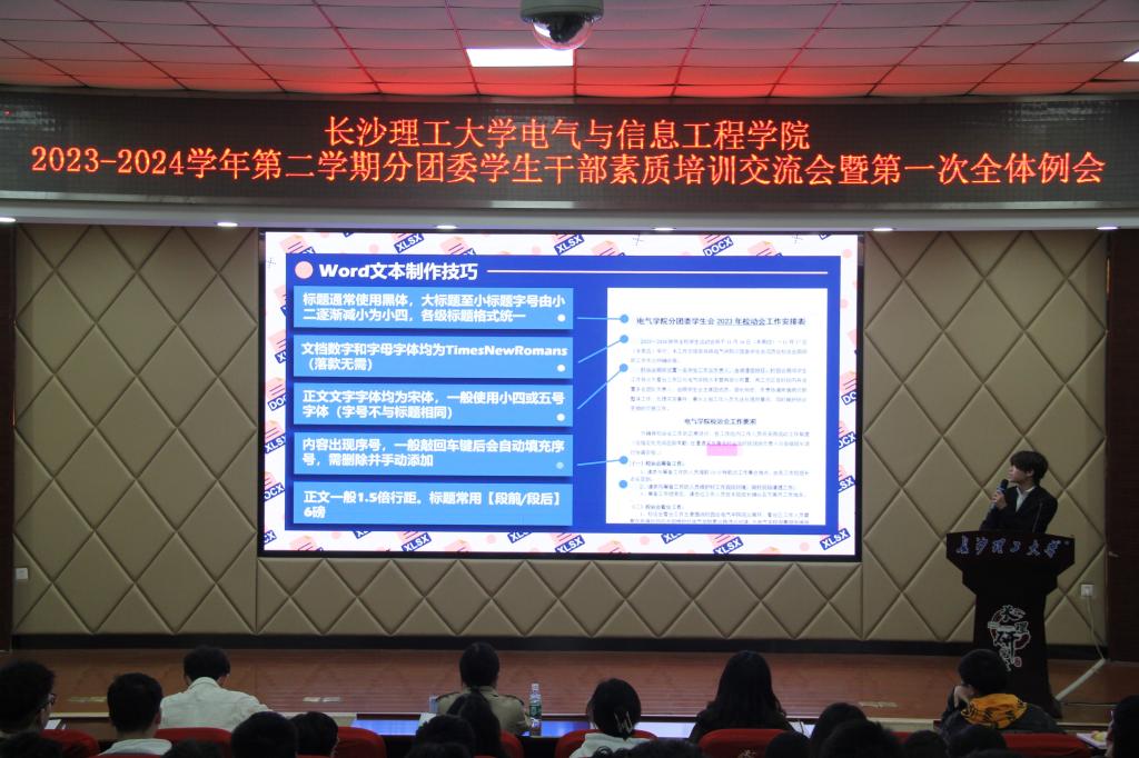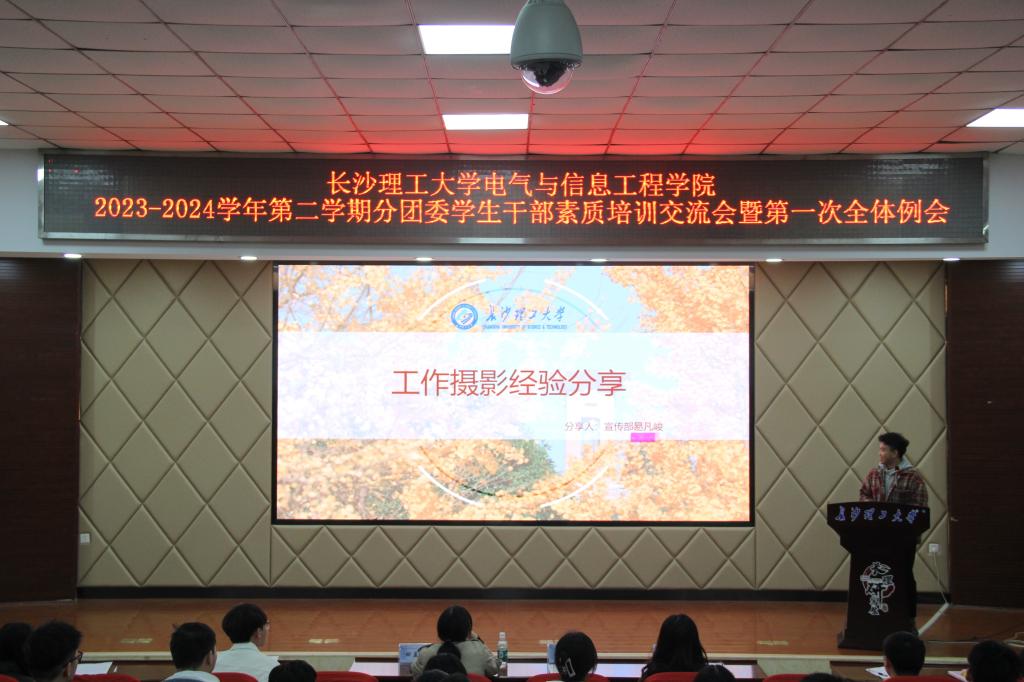 随后是经验分享和素质培训交流环节。分团委前任宣传部部长梁晨同学以“做有思想的行动者”为题做分享交流发言,她围绕“热爱、责任、互相成就”三个关键词,结合个人学生干部经历,认为学生干部们应合理规划自己的工作与学习,使得两厢收益,良性互动。电气2002班王钰清、电气2008班刘嘉庆分享了自己大学学业规划及考研经验。电气2202班黄国洵就办公软件使用技巧进行了讲解培训、执行主席孟令就新闻稿的格式及写作分享了自己的经验、宣传部易凡峻就会议活动的摄影进行了讲解培训。