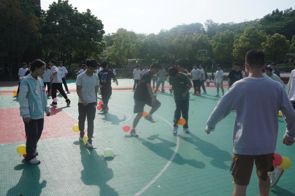 “青春破晓,热血激昂”,每组四名同学在腿上绑六只气球,踩破其他组气球的同时保护自己的气球,最终留有气球的小组胜利。此时此刻赛场上八仙过海,各显神通,少年活力在此刻尽显风采。